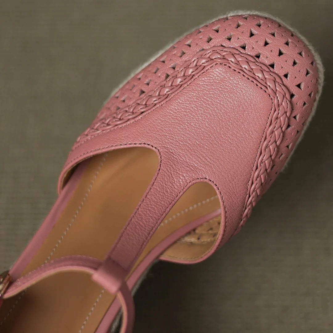 Genuine leather Boho Narrow t-strap Hemp wedge Platform sandals Square toe